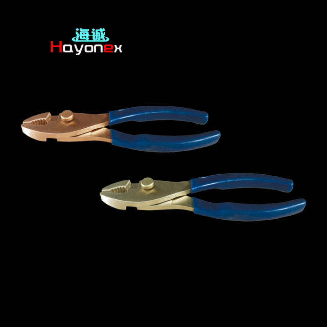 防爆鯉魚(yú)鉗:它的常用的規(guī)格為6寸和8寸。它用于夾持扁形或圓柱形金屬零件,其鉗口的開(kāi)口寬度有兩檔調(diào)節(jié)位置,可以?shī)A持尺寸較大的零件,刃口可切斷金屬絲,亦可代替扳手裝卸螺栓螺母。它的材質(zhì)為鋁青銅和鈹青銅。表面呈現(xiàn)原銅色。適用于石油、化工等易燃易爆場(chǎng)所。