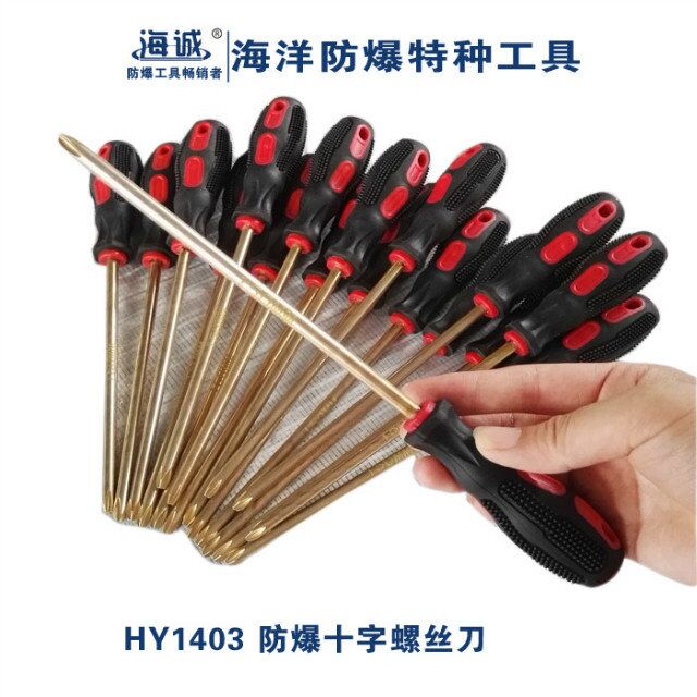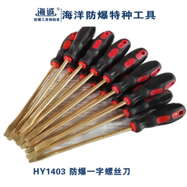 防爆工具 、防爆螺絲刀,均采用鋁青銅合金、鈹青銅合金制作,是我們常規(guī)的防爆螺絲刀的樣式,工作端為一字(十字),橡膠手把。一種用來擰轉螺絲釘以迫使其位的工具,通常有一個薄楔形頭,可插入螺絲釘頭的槽縫或凹口內――亦稱“改錐”。主要有兩種規(guī)格一字(負號)和十字(正號)。常見的還有六角螺絲刀,包括內六角和外六角兩種。防爆螺絲刀又區(qū)分為傳統(tǒng)螺絲起子(英文:Screwdriver)和棘輪螺絲起子(電動螺絲起子)(英文:Ratchet screwdriver)。傳統(tǒng)的防爆螺絲刀是由一個塑膠手把外加一個可以鎖螺絲的鐵棒,而棘輪螺絲起子則是由一個塑膠手把外加一個棘輪機構。后者讓鎖螺絲的鐵棒可以順時針或逆時針空轉,借由空轉的機能達到促進鎖螺絲的效率,而不需逐次將動力驅動器(手)轉回原本的位置。防爆旋具還包括:防爆敲擊螺絲刀、防爆星型螺絲刀、、、、