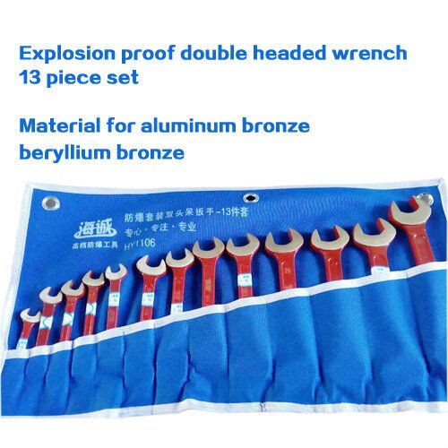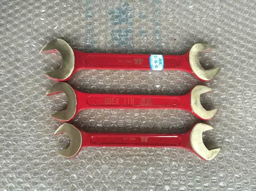 防爆雙頭呆扳手是一種常用的工具之一,為裝配機(jī)床或備件以及交通運(yùn)輸、農(nóng)用機(jī)械維修必需的手工具。 防爆雙頭呆扳手選用鋁青銅、鈹青銅制造工藝,工藝先進(jìn)質(zhì)量有保證。防爆雙頭呆扳手有以下型號(mm)8*10、10*12、12*14、14*17、16*18、17*19、19*22、22*24、24*27、 27*30、30*32、32*34、32*36、34*36、36*38、36*41、38*41、41*46、46*50、50*55、55*60、 60*65、65*70、70*75共24種規(guī)格,這些產(chǎn)品規(guī)格應(yīng)該能滿足客戶朋友們的大量需求。防爆雙頭呆扳手材質(zhì)主要分為鋁青銅和鈹青銅兩種。防爆工具這兩種材質(zhì)從顏色分鋁青銅是黃色的、鈹青銅是黃紅色。從硬度分鋁青銅HRC25而鈹青銅HRC35。這兩種材質(zhì)的產(chǎn)品都具有同樣的防爆功效,其中的鈹銅產(chǎn)品還有防磁的功能,因此對于工作環(huán)境要求更加嚴(yán)格的工作場所里特別適合使用。防爆雙頭呆扳手套裝采用鈹青銅、鋁青銅合金材料制成。規(guī)格分為6件套、8件套、11件套、13件套